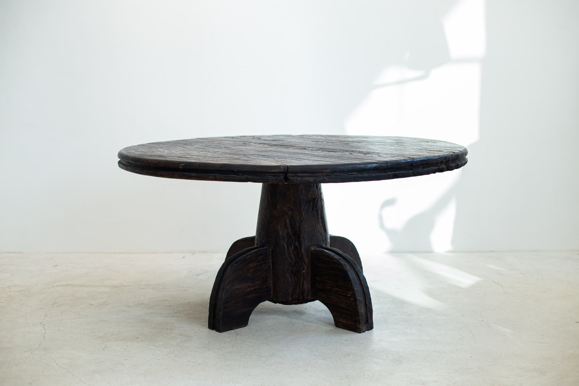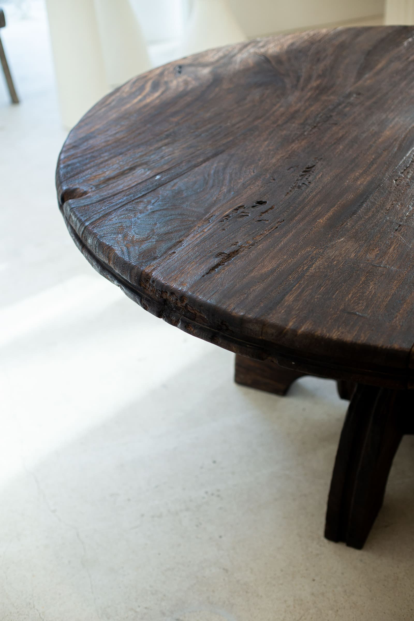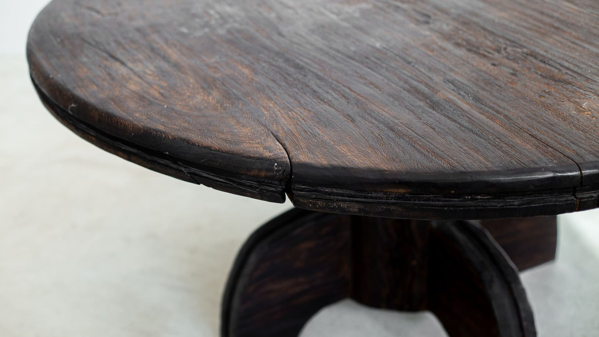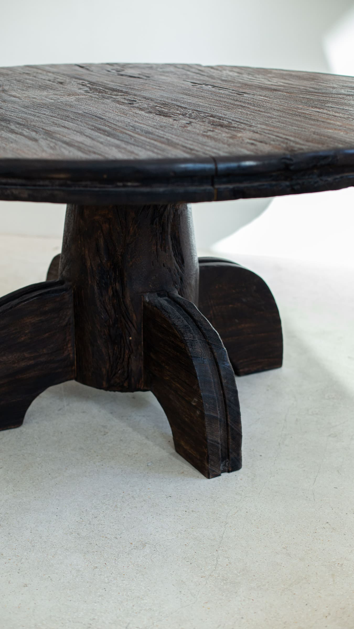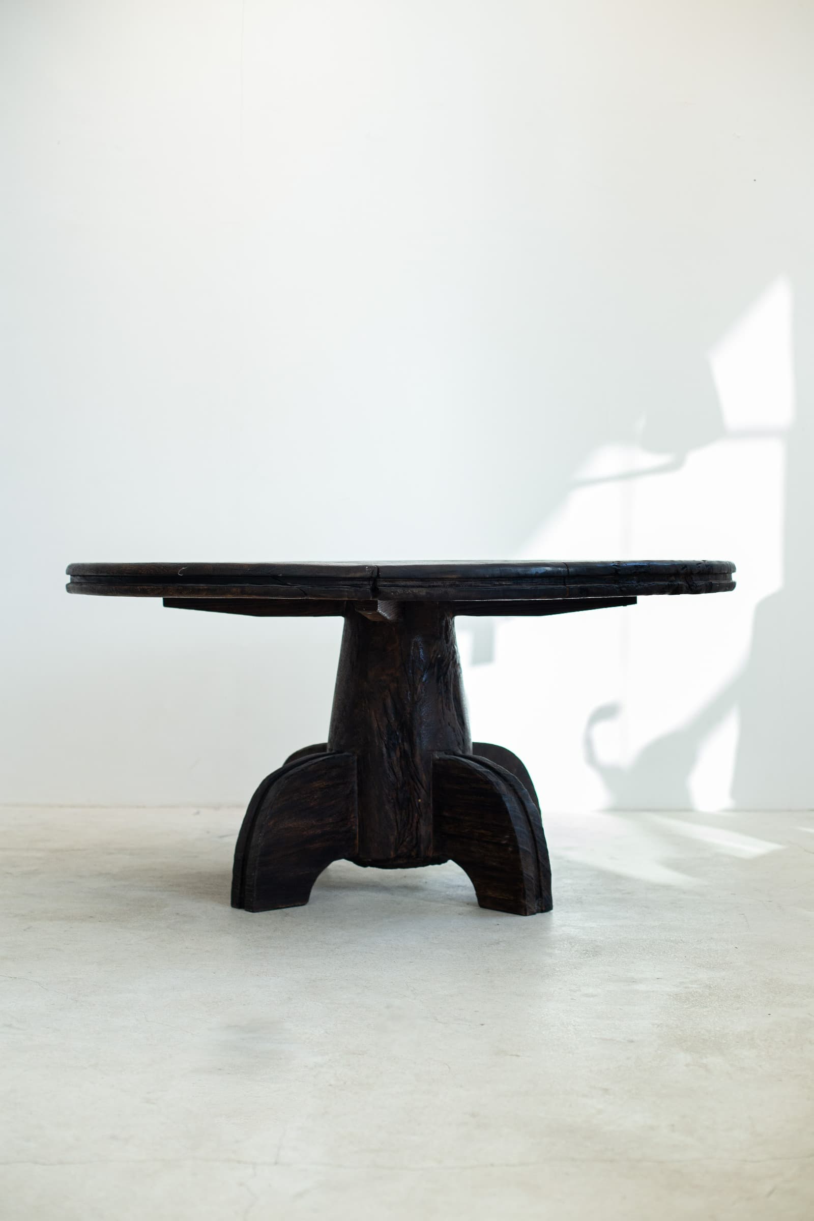 AGED CIRCULAR TOP ON PEDESTAL BASED TIMBER, CONSTRUCTION SHOU SUGI BAN FINISH